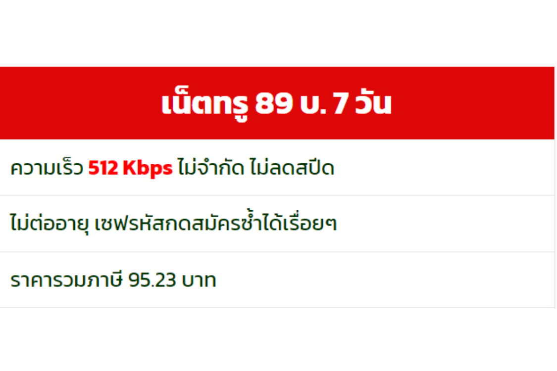 แพ็กเกจที่ 1 ความเร็ว 512 Kbps ไม่ลดสปีด ไม่จำกัดปริมาณการใช้งาน ใช้งานได้ 7 วัน