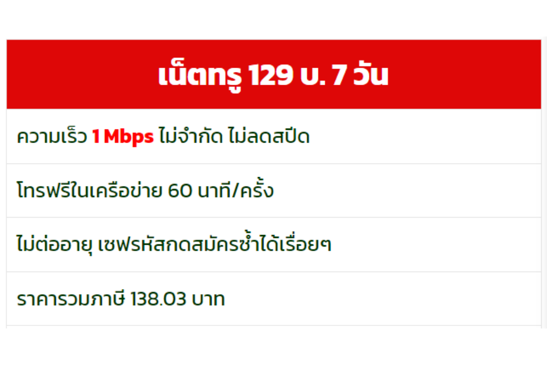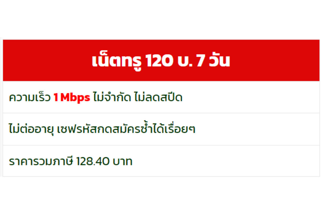 แพ็กเกจที่ 1 ความเร็ว 1 Mbps ไม่ลดสปีด ไม่จำกัดปริมาณการใช้งาน ใช้งานได้ 7 วัน