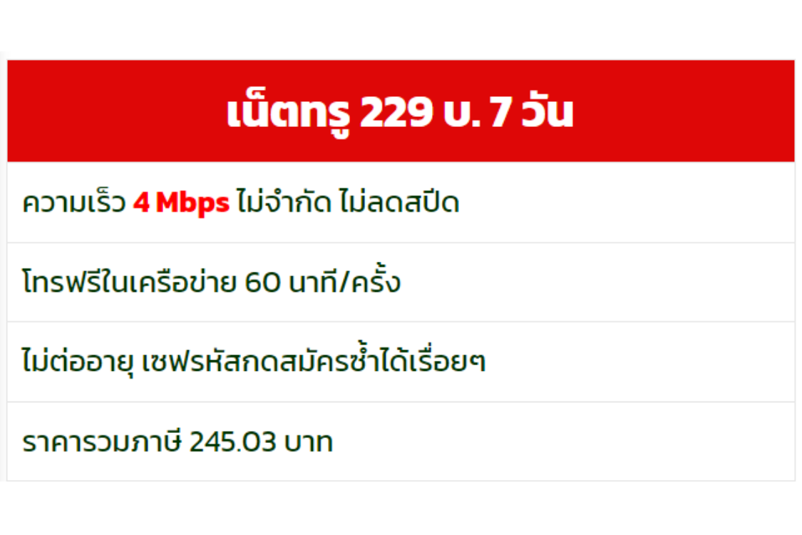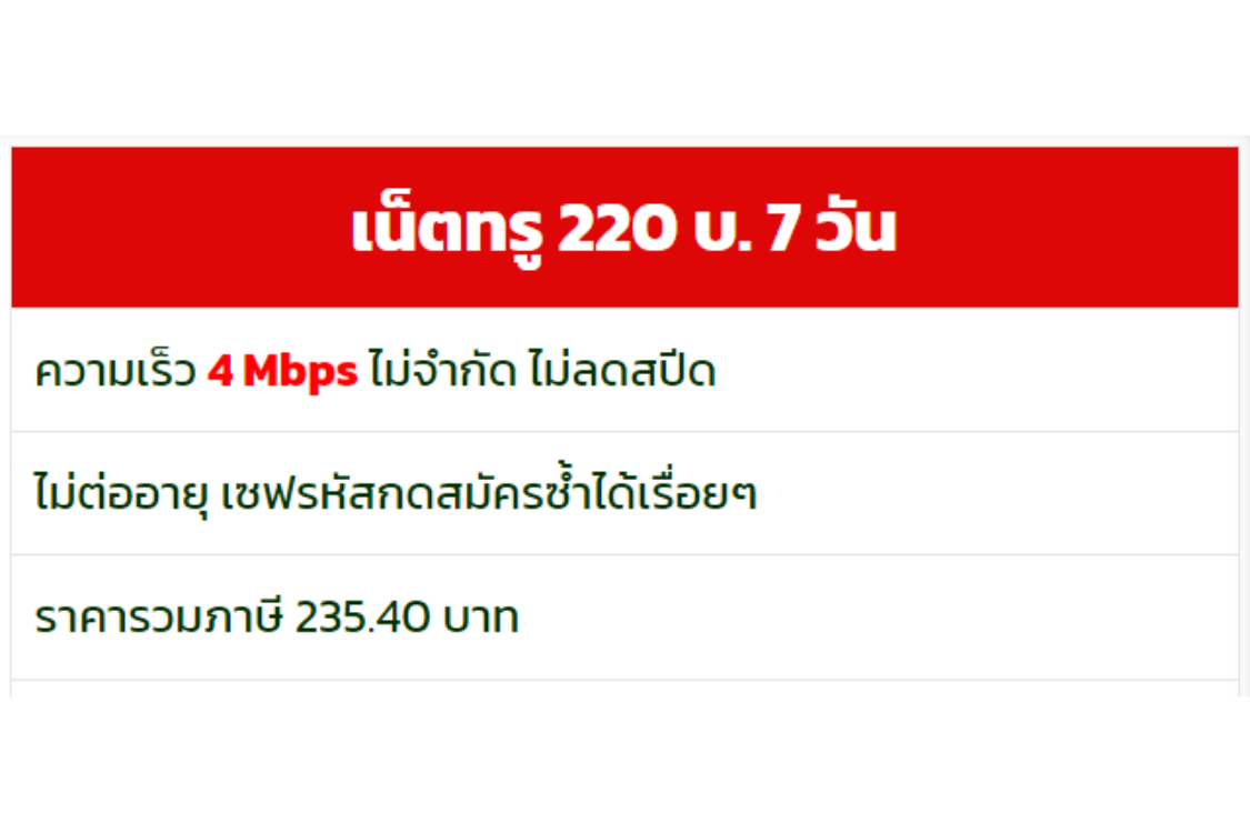 แพ็กเกจที่ 2 ความเร็ว 4 Mbps ไม่ลดสปีด ไม่จำกัดปริมาณการใช้งาน ใช้งานได้ 7 วัน
